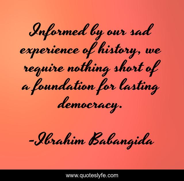 This page presents the quote "Informed by our sad experience of history, we require nothing short of a foundation for lasting democracy.". Author of this quote is Ibrahim Babangida. This quote is about short, experience, history,.