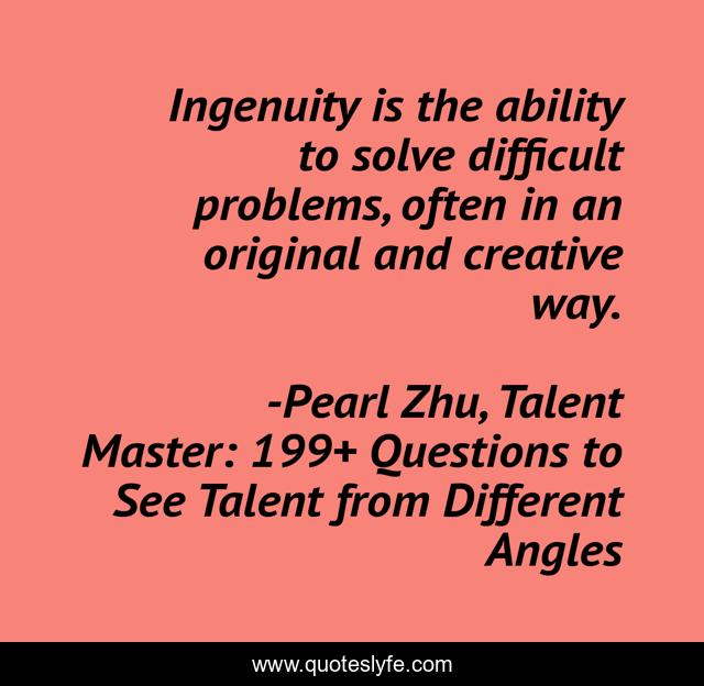 This page presents the quote "Ingenuity is the ability to solve difficult problems, often in an original and creative way.". Author of this quote is Pearl Zhu, Talent Master: 199+ Questions to See Talent from Different Angles. This quote is about innovation, ingenuity, original, talent-management,.