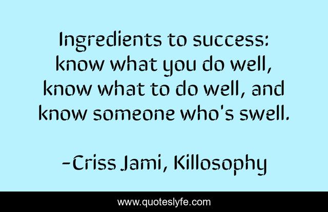 "Criss Jami, Killosophy Quotes." Quoteslyfe.com, 2025. Fri. 05 Dec. 2025. <https://www.quoteslyfe.com/quote/Ingredients-to-success-know-what-you-do-119227>.