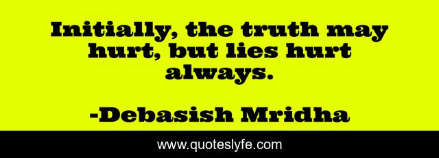 This page presents the quote "Initially, the truth may hurt, but lies hurt always.". Author of this quote is Debasish Mridha. This quote is about lies-hurt, inspirational, lies, philosophy, debasish-mridha, quotes, truth, enthusiasm, debasish-mridha-m-d,.
