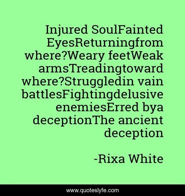 This page presents the quote "Injured SoulFainted EyesReturningfrom where?Weary feetWeak armsTreadingtoward where?Struggledin vain battlesFightingdelusive enemiesErred bya deceptionThe ancient deception". Author of this quote is Rixa White. This quote is about delusive-enemies, injured, eyes, deception, weak-arms, the-ancient-deception, soul, battles, struggled-in-vain,.