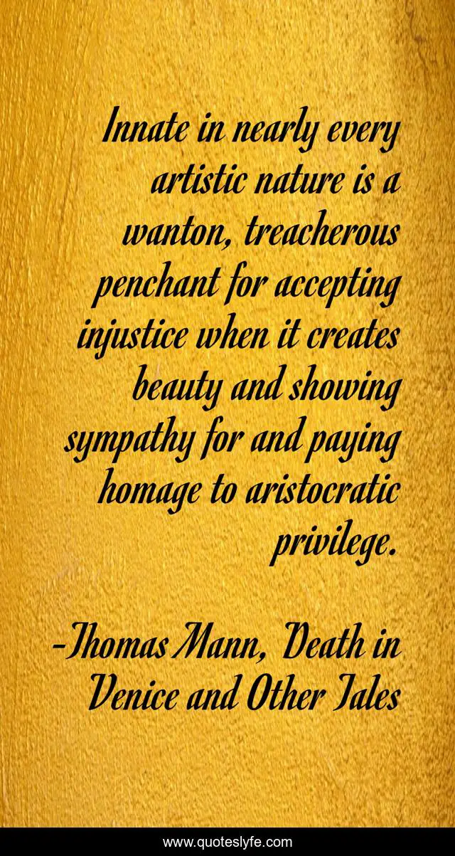 This page presents the quote "Innate in nearly every artistic nature is a wanton, treacherous penchant for accepting injustice when it creates beauty and showing sympathy for and paying homage to aristocratic privilege.". Author of this quote is Thomas Mann, Death in Venice and Other Tales. This quote is about art, wealth, beauty, creativity, ignorance, capitalism, sympathy, bias, subjectivity,.