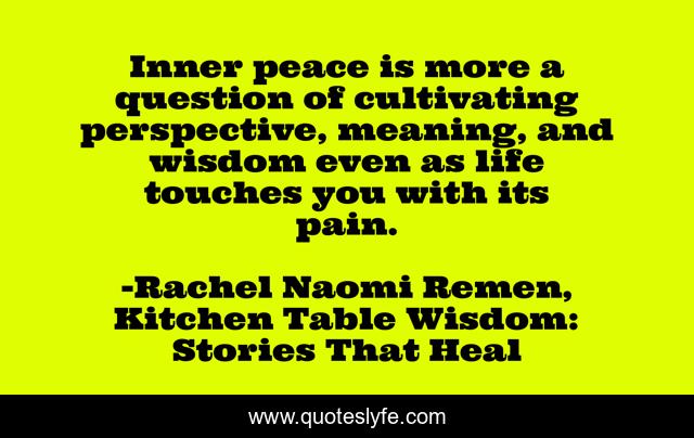 This page presents the quote "Inner peace is more a question of cultivating perspective, meaning, and wisdom even as life touches you with its pain.". Author of this quote is Rachel Naomi Remen, Kitchen Table Wisdom: Stories That Heal. This quote is about life, pain, peace, wisdom, meaning, perspective, inner-peace,.