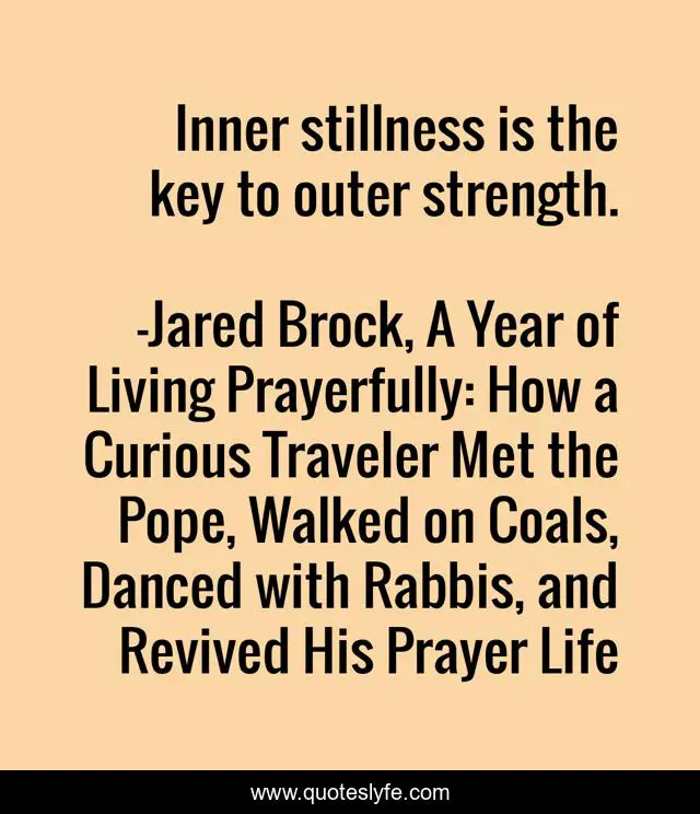 "Jared Brock, A Year of Living Prayerfully: How a Curious Traveler Met the Pope, Walked on Coals, Danced with Rabbis, and Revived His Prayer Life Quotes." Quoteslyfe.com, 2025. Fri. 05 Dec. 2025. <https://www.quoteslyfe.com/quote/Inner-stillness-is-the-key-to-outer-104660>.