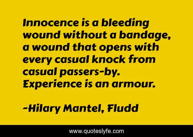 This page presents the quote "Innocence is a bleeding wound without a bandage, a wound that opens with every casual knock from casual passers-by. Experience is an armour.". Author of this quote is Hilary Mantel, Fludd. This quote is about experience, life-lessons, innocence,.
