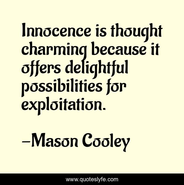 This page presents the quote "Innocence is thought charming because it offers delightful possibilities for exploitation.". Author of this quote is Mason Cooley. This quote is about exploitation, charm, innocence,.
