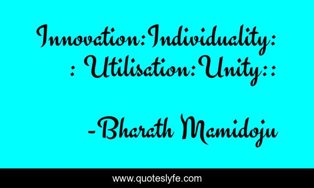 This page presents the quote "Innovation:Individuality:: Utilisation:Unity::". Author of this quote is Bharath Mamidoju. .