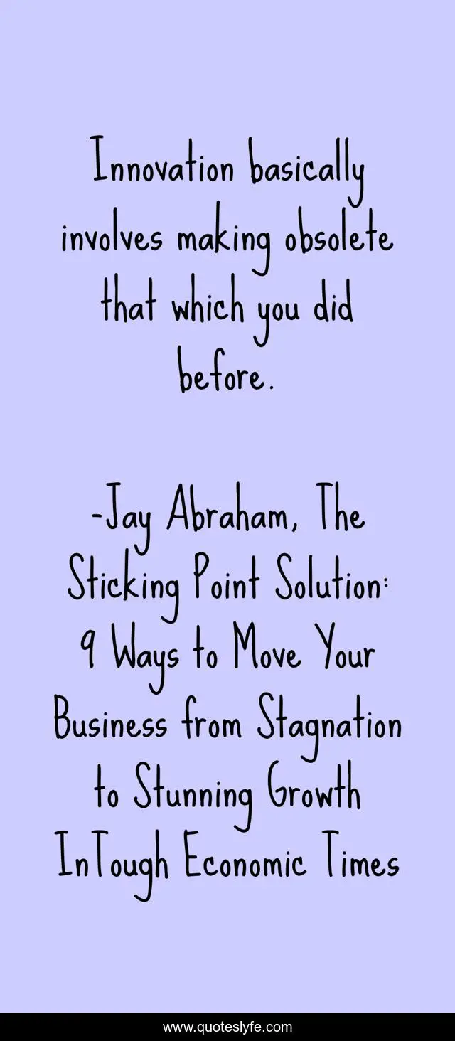 "Jay Abraham, The Sticking Point Solution: 9 Ways to Move Your Business from Stagnation to Stunning Growth InTough Economic Times Quotes." Quoteslyfe.com, 2025. Fri. 05 Dec. 2025. <https://www.quoteslyfe.com/quote/Innovation-basically-involves-making-obsolete-that-which-107866>.