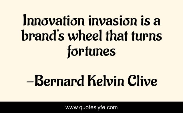 This page presents the quote "Innovation invasion is a brand's wheel that turns fortunes". Author of this quote is Bernard Kelvin Clive. This quote is about branding, technology, brand-innovation, creativity,.