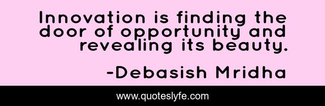 This page presents the quote "Innovation is finding the door of opportunity and revealing its beauty.". Author of this quote is Debasish Mridha. This quote is about philosophy, debasish-mridha, quotes, revealing-beauty, debasish-mridha-md, inspirational, innovation, enthusiasm, door-of-opportunity,.