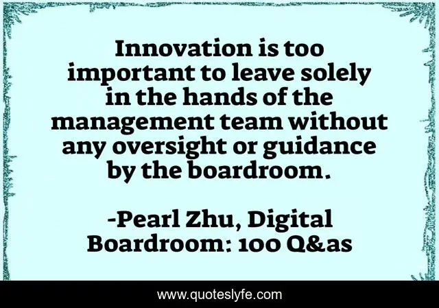 This page presents the quote "Innovation is too important to leave solely in the hands of the management team without any oversight or guidance by the boardroom.". Author of this quote is Pearl Zhu, Digital Boardroom: 100 Q&as. This quote is about boardroom, digitalization, innovation,.