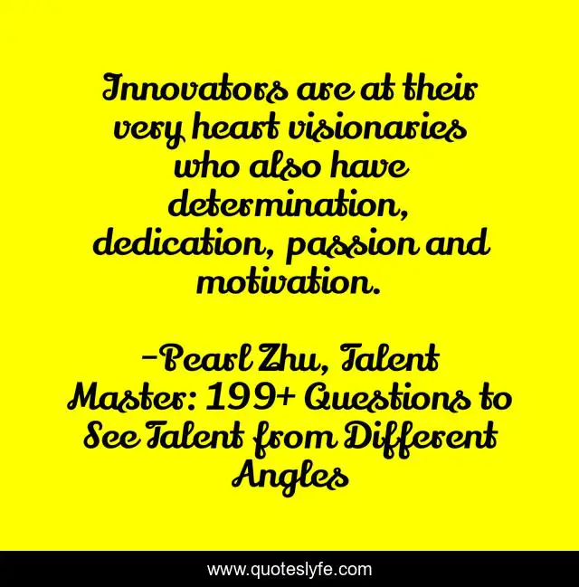 This page presents the quote "Innovators are at their very heart visionaries who also have determination, dedication, passion and motivation.". Author of this quote is Pearl Zhu, Talent Master: 199+ Questions to See Talent from Different Angles. This quote is about talent-master, visionary-leader, innovation,.
