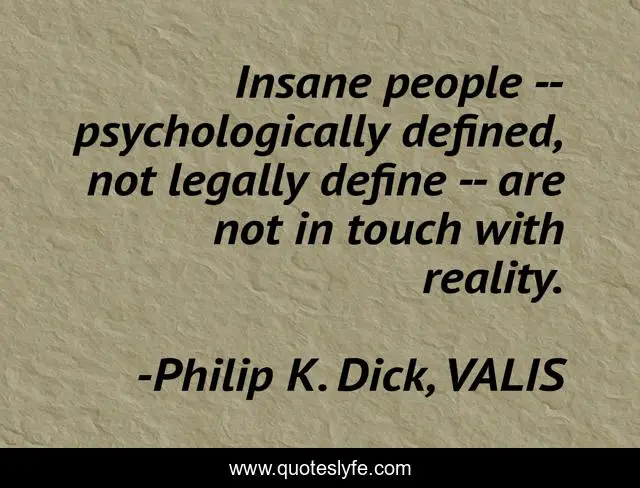 This page presents the quote "Insane people -- psychologically defined, not legally define -- are not in touch with reality.". Author of this quote is Philip K. Dick, VALIS. This quote is about insane, reality,.