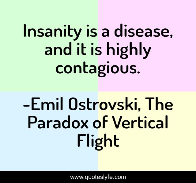 This page presents the quote "Insanity is a disease, and it is highly contagious.". Author of this quote is Emil Ostrovski, The Paradox of Vertical Flight. .