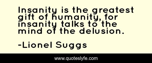 This page presents the quote "Insanity is the greatest gift of humanity, for insanity talks to the mind of the delusion.". Author of this quote is Lionel Suggs. This quote is about humanity, insanity,.