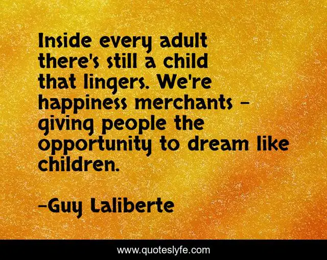 This page presents the quote "Inside every adult there's still a child that lingers. We're happiness merchants - giving people the opportunity to dream like children.". Author of this quote is Guy Laliberte. This quote is about opportunity, children, child,.
