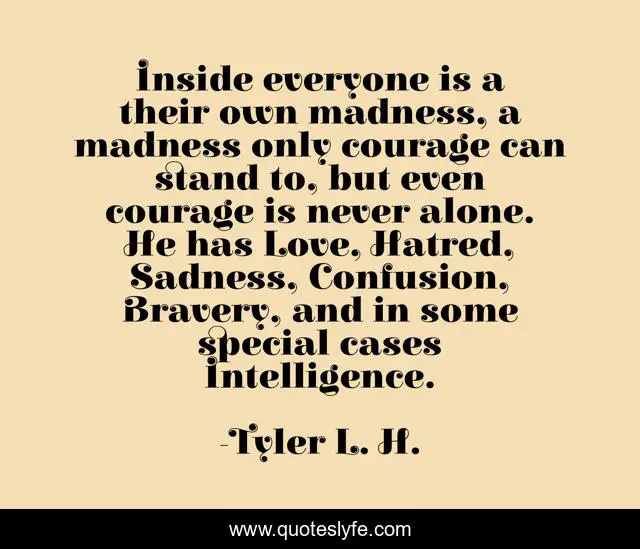 This page presents the quote "Inside everyone is a their own madness, a madness only courage can stand to, but even courage is never alone. He has Love, Hatred, Sadness, Confusion, Bravery, and in some special cases Intelligence.". Author of this quote is Tyler L. H.. This quote is about courage, madness, inspiration,.