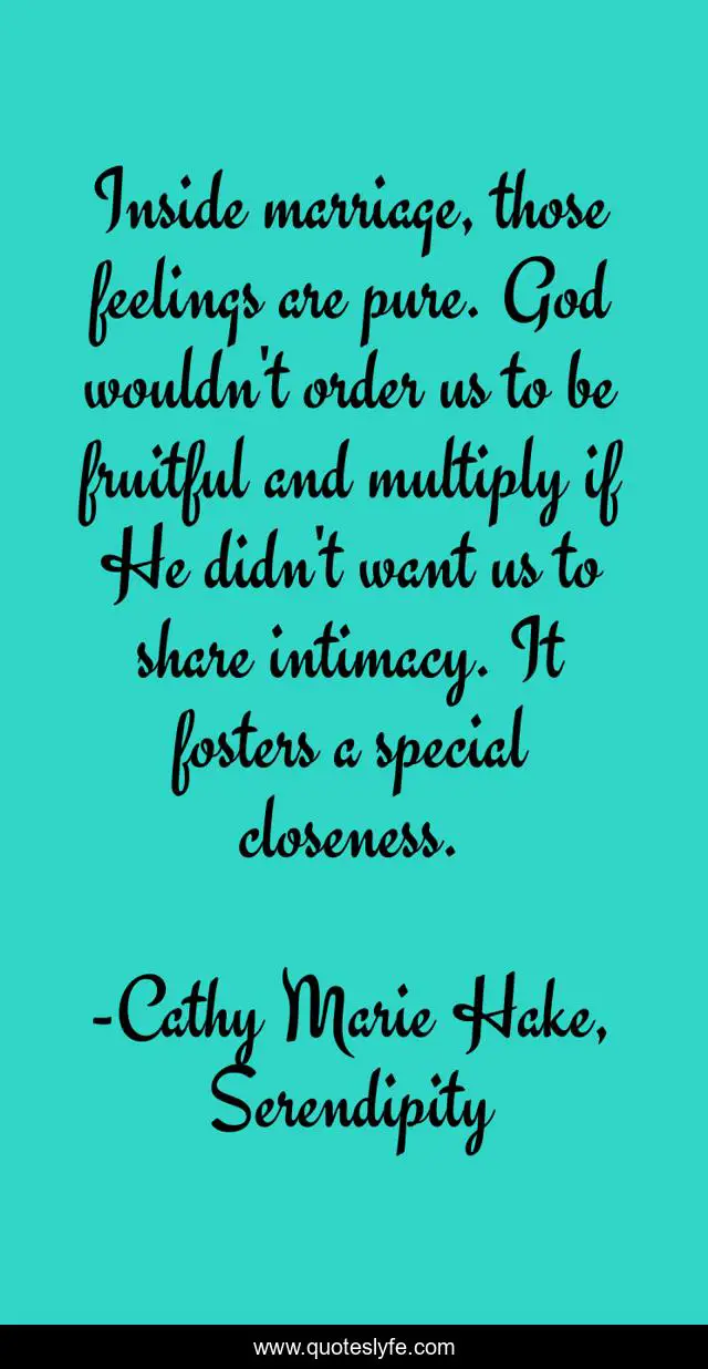 This page presents the quote "Inside marriage, those feelings are pure. God wouldn't order us to be fruitful and multiply if He didn't want us to share intimacy. It fosters a special closeness.". Author of this quote is Cathy Marie Hake, Serendipity. This quote is about enthusiasm, marriage, inspirational,.