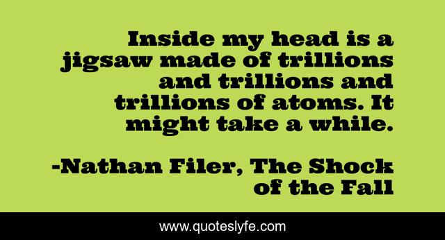This page presents the quote "Inside my head is a jigsaw made of trillions and trillions and trillions of atoms. It might take a while.". Author of this quote is Nathan Filer, The Shock of the Fall. This quote is about enthusiasm, inspirational, mental-illness,.