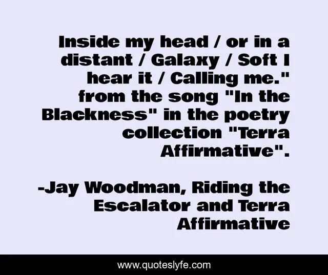 This page presents the quote "Inside my head / or in a distant / Galaxy / Soft I hear it / Calling me." from the song "In the Blackness" in the poetry collection "Terra Affirmative".". Author of this quote is Jay Woodman, Riding the Escalator and Terra Affirmative. This quote is about poem, calling, blackness, galaxy, song,.