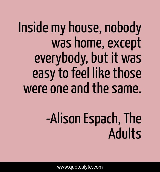 This page presents the quote "Inside my house, nobody was home, except everybody, but it was easy to feel like those were one and the same.". Author of this quote is Alison Espach, The Adults. This quote is about adulthood, house, loneliness, father, parents, mother, home, childhood, depression,.