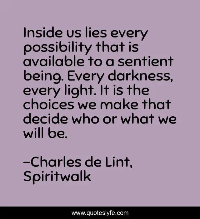 This page presents the quote "Inside us lies every possibility that is available to a sentient being. Every darkness, every light. It is the choices we make that decide who or what we will be.". Author of this quote is Charles de Lint, Spiritwalk. This quote is about dark, light, sentient-beings, possibility, choices,.