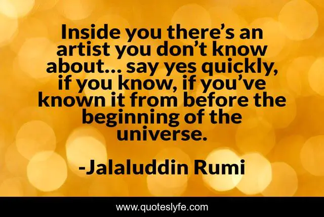 This page presents the quote "Inside you there’s an artist you don’t know about… say yes quickly, if you know, if you’ve known it from before the beginning of the universe.". Author of this quote is Jalaluddin Rumi. .