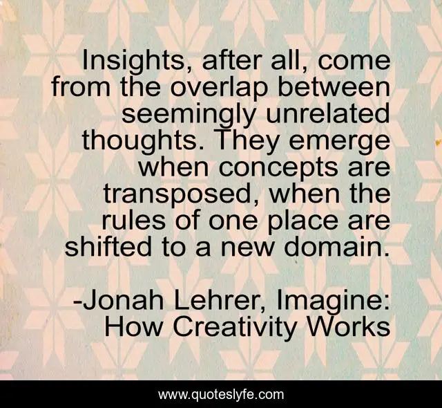 This page presents the quote "Insights, after all, come from the overlap between seemingly unrelated thoughts. They emerge when concepts are transposed, when the rules of one place are shifted to a new domain.". Author of this quote is Jonah Lehrer, Imagine: How Creativity Works. .