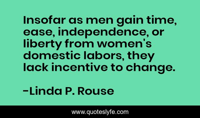 This page presents the quote "Insofar as men gain time, ease, independence, or liberty from women's domestic labors, they lack incentive to change.". Author of this quote is Linda P. Rouse. .