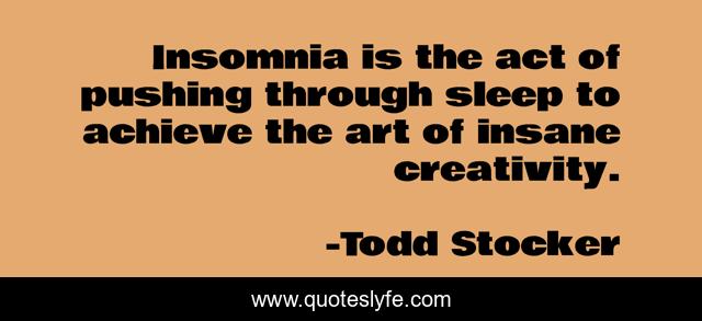 This page presents the quote "Insomnia is the act of pushing through sleep to achieve the art of insane creativity.". Author of this quote is Todd Stocker. This quote is about confidence, positive, motivational, insomnia, optimistic, inspirational, enthusiasm,.