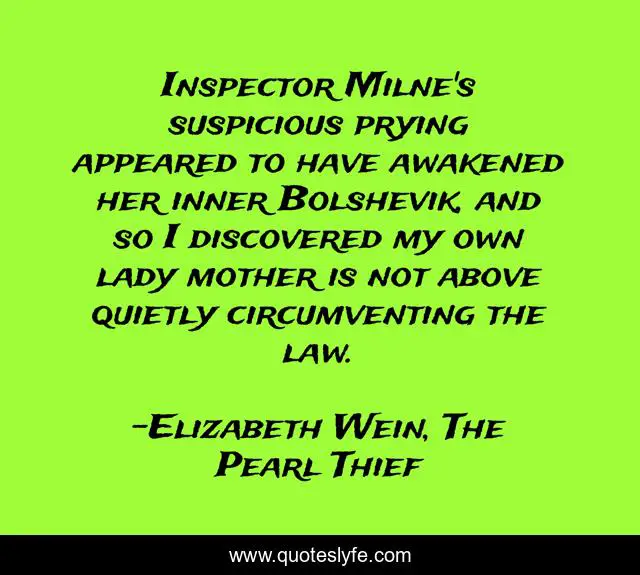 This page presents the quote "Inspector Milne's suspicious prying appeared to have awakened her inner Bolshevik, and so I discovered my own lady mother is not above quietly circumventing the law.". Author of this quote is Elizabeth Wein, The Pearl Thief. This quote is about surprising, mother, delightful, 1930s, bolshevik, innovative, curious, the-pearl-thief, elizabeth-wein,.
