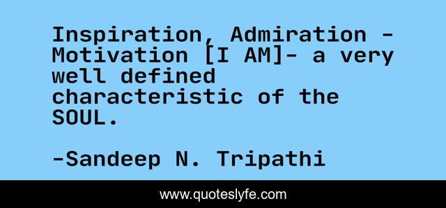 This page presents the quote "Inspiration, Admiration - Motivation [I AM]- a very well defined characteristic of the SOUL.". Author of this quote is Sandeep N. Tripathi. This quote is about motivational-inspirational, admiration, inspriation, motivation, soul,.