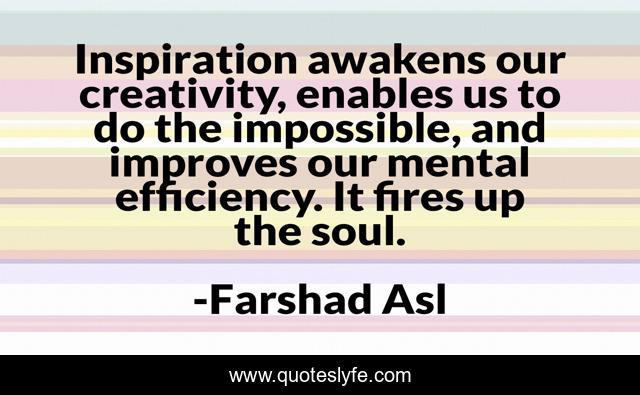 This page presents the quote "Inspiration awakens our creativity, enables us to do the impossible, and improves our mental efficiency. It fires up the soul.". Author of this quote is Farshad Asl. This quote is about creativity, soul, inspiration,.