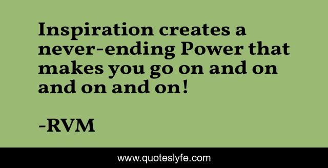 This page presents the quote "Inspiration creates a never-ending Power that makes you go on and on and on and on!". Author of this quote is RVM. This quote is about motivation, inspiration,.