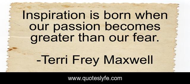 This page presents the quote "Inspiration is born when our passion becomes greater than our fear.". Author of this quote is Terri Frey Maxwell. This quote is about enthusiasm, growth, inspirational, entrepreneurship,.