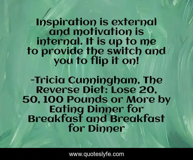 This page presents the quote "Inspiration is external and motivation is internal. It is up to me to provide the switch and you to flip it on!". Author of this quote is Tricia Cunningham, The Reverse Diet: Lose 20, 50, 100 Pounds or More by Eating Dinner for Breakfast and Breakfast for Dinner. This quote is about diet, inspiration,.