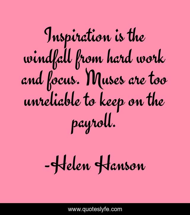 This page presents the quote "Inspiration is the windfall from hard work and focus. Muses are too unreliable to keep on the payroll.". Author of this quote is Helen Hanson. This quote is about hard-work, focus, muse, inspiration,.