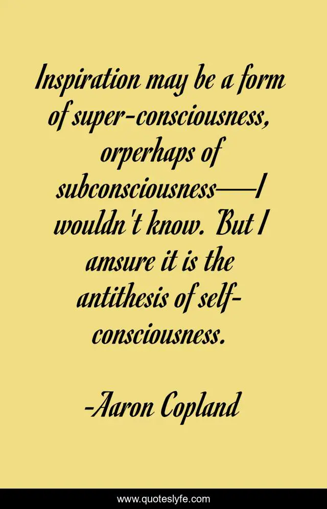 This page presents the quote "Inspiration may be a form of super-consciousness, orperhaps of subconsciousness—I wouldn't know. But I amsure it is the antithesis of self-consciousness.". Author of this quote is Aaron Copland. This quote is about criticism, philosophy, music,.