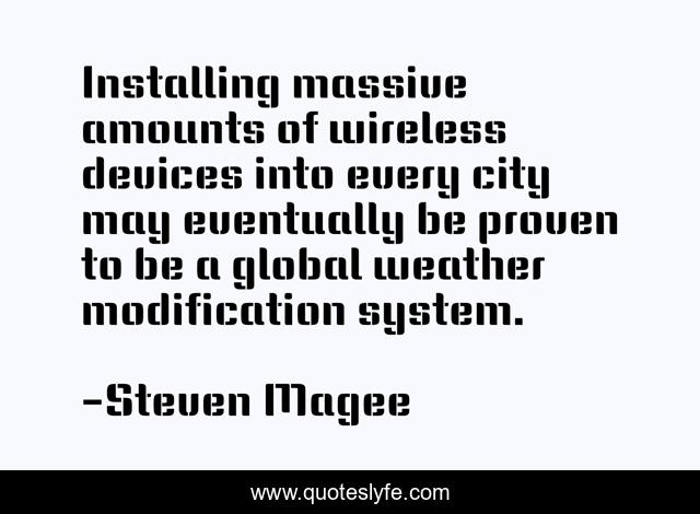 This page presents the quote "Installing massive amounts of wireless devices into every city may eventually be proven to be a global weather modification system.". Author of this quote is Steven Magee. This quote is about city, eventually, amounts, global, installing, proven, system, wireless, weather,.