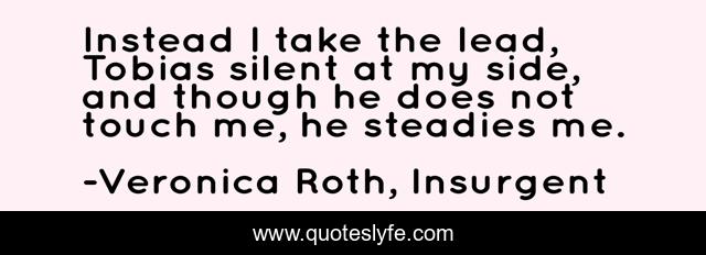This page presents the quote "Instead I take the lead, Tobias silent at my side, and though he does not touch me, he steadies me.". Author of this quote is Veronica Roth, Insurgent. This quote is about relationships, insurgent, love, leadership, trust, affection,.