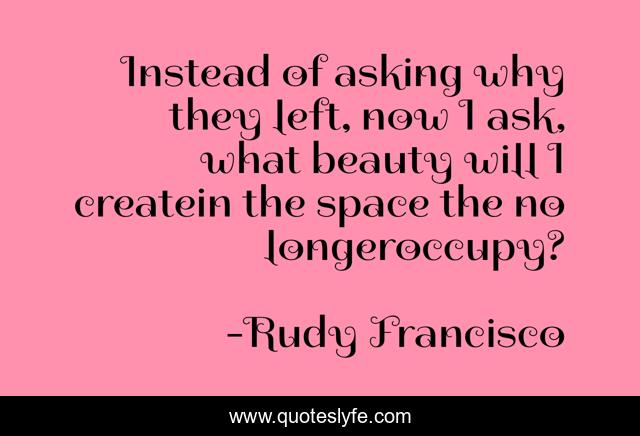 This page presents the quote "Instead of asking why they left, now I ask, what beauty will I createin the space the no longeroccupy?". Author of this quote is Rudy Francisco. This quote is about loss, creativity,.