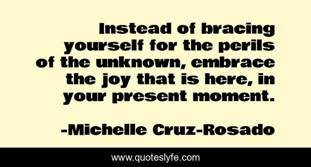 This page presents the quote "Instead of bracing yourself for the perils of the unknown, embrace the joy that is here, in your present moment.". Author of this quote is Michelle Cruz-Rosado. This quote is about confidence, positive, motivational, michelle-rosado, optimistic, inspirational, enthusiasm, live-in-the-moment,.