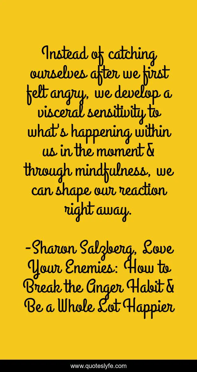 This page presents the quote "Instead of catching ourselves after we first felt angry, we develop a visceral sensitivity to what's happening within us in the moment & through mindfulness, we can shape our reaction right away.". Author of this quote is Sharon Salzberg, Love Your Enemies: How to Break the Anger Habit & Be a Whole Lot Happier. This quote is about anger, buddhism, self-help, wisdom,.