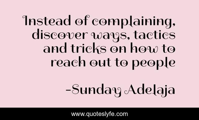 This page presents the quote "Instead of complaining, discover ways, tactics and tricks on how to reach out to people". Author of this quote is Sunday Adelaja. This quote is about life, blessing, finance, complaining, money, purpose, work, wisdom, job,.