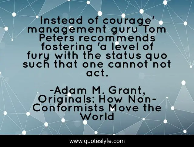 This page presents the quote "Instead of courage' management guru Tom Peters recommends fostering 'a level of fury with the status quo such that one cannot not act.". Author of this quote is Adam M. Grant, Originals: How Non-Conformists Move the World. This quote is about anger, fury, motivation, status-quo,.