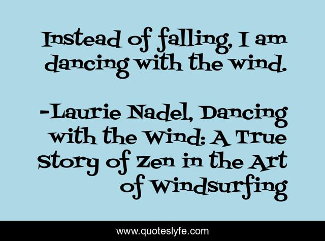 This page presents the quote "Instead of falling, I am dancing with the wind.". Author of this quote is Laurie Nadel, Dancing with the Wind: A True Story of Zen in the Art of Windsurfing. This quote is about dancing, quote-of-the-day, dan-rather, wayne-dyer, inspirational, quote-about-life, enthusiasm, falling, quotes-twitter,.