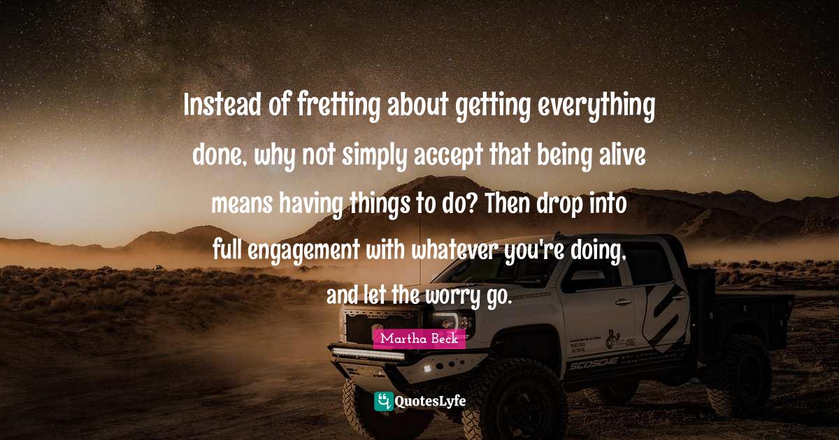 This page presents the quote "Instead of fretting about getting everything done, why not simply accept that being alive means having things to do? Then drop into full engagement with whatever you're doing, and let the worry go.". Author of this quote is Martha Beck. This quote is about engagement, why not, fretting, worry, alive, things to do, mean, done,.