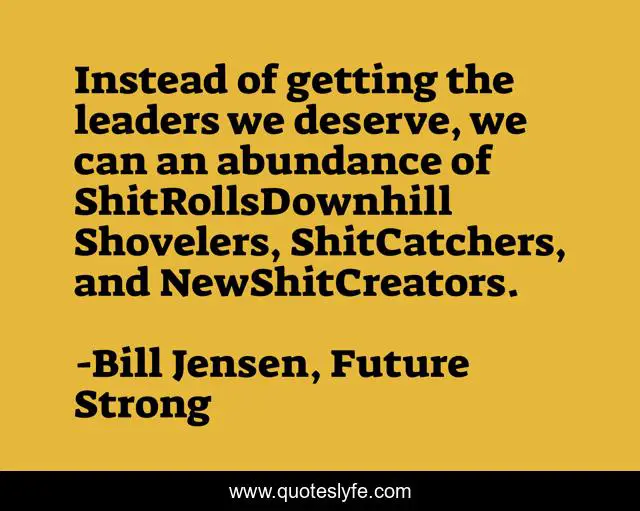 This page presents the quote "Instead of getting the leaders we deserve, we can an abundance of ShitRollsDownhill Shovelers, ShitCatchers, and NewShitCreators.". Author of this quote is Bill Jensen, Future Strong. This quote is about enthusiasm, future, leadership, inspirational, self-help,.