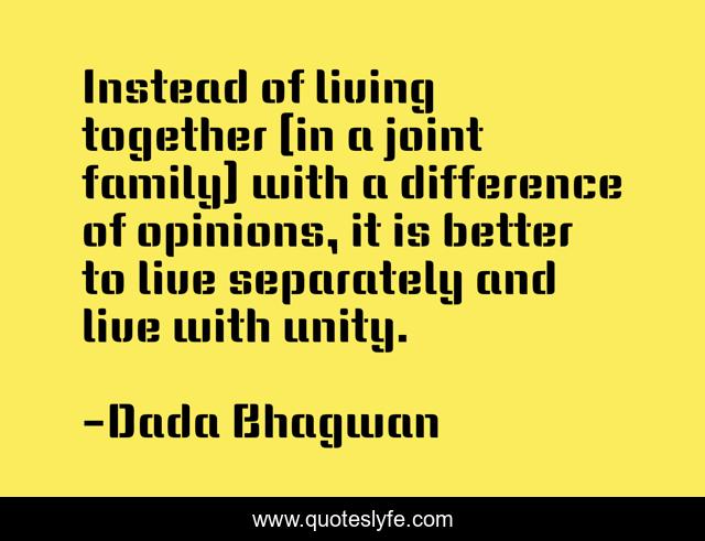 This page presents the quote "Instead of living together (in a joint family) with a difference of opinions, it is better to live separately and live with unity.". Author of this quote is Dada Bhagwan. This quote is about opinion, spiritual, unity, better-ot-live,.