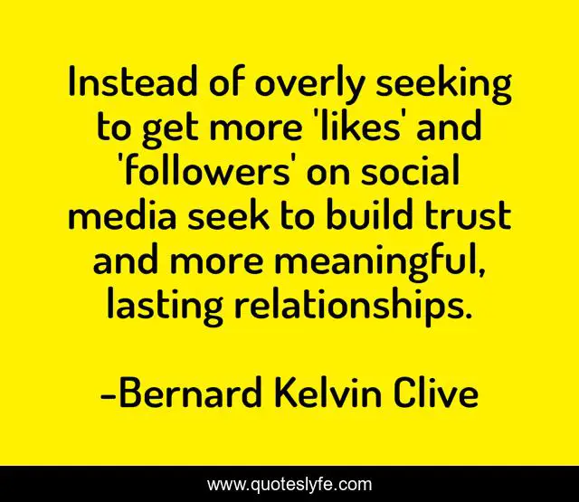This page presents the quote "Instead of overly seeking to get more 'likes' and 'followers' on social media seek to build trust and more meaningful, lasting relationships.". Author of this quote is Bernard Kelvin Clive. This quote is about branding, social-media, trust, personal-branding,.